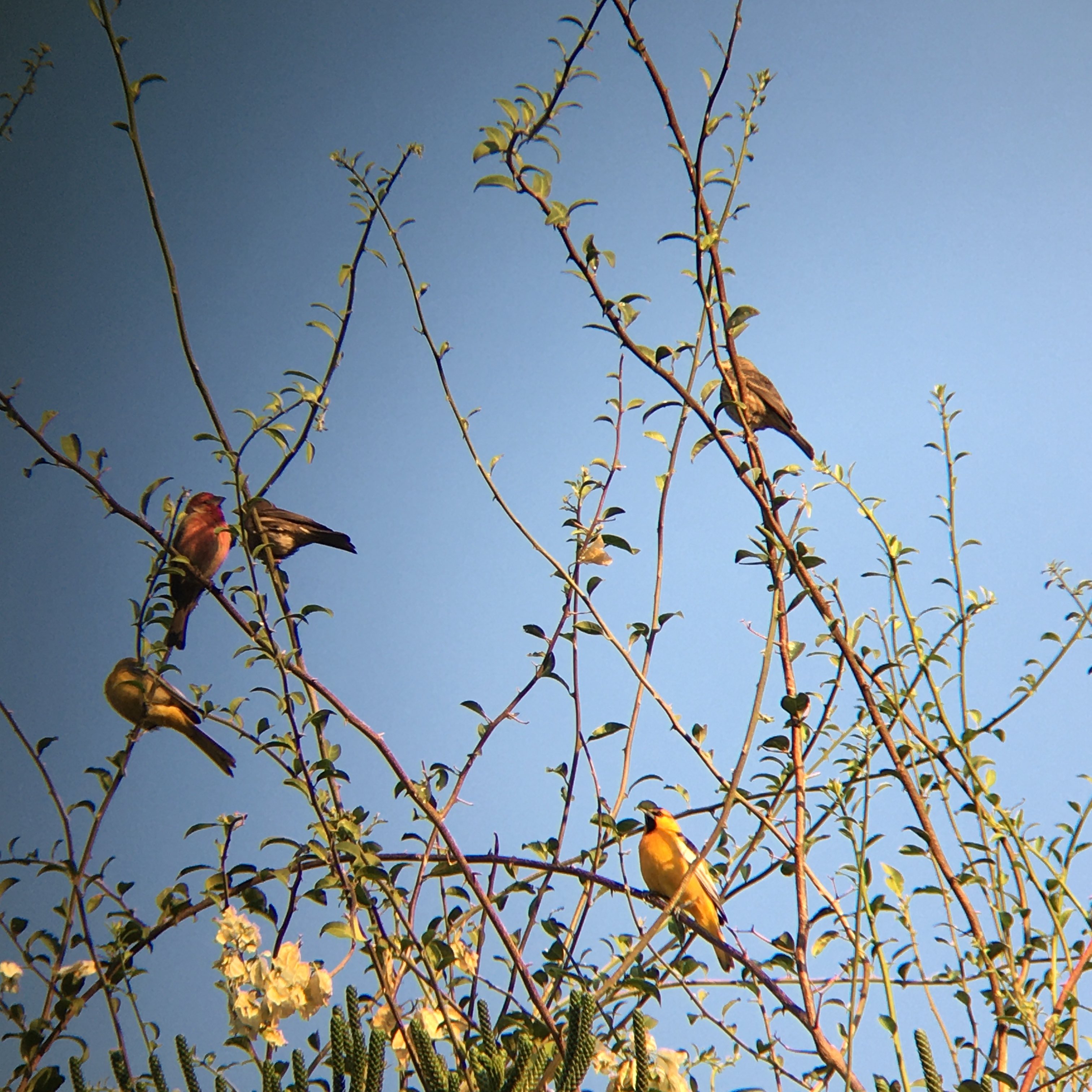 Header photo of orioles and finches wintering in Mexico by Rodrigo López.